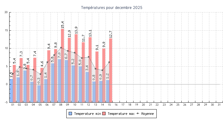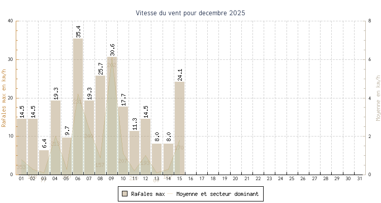 | 15 | 1.2 °C à 04:33 | 12.7 °C à 14:15 | 6.1 °C | 1.8 km/h (24.1 km/h) | 170 |