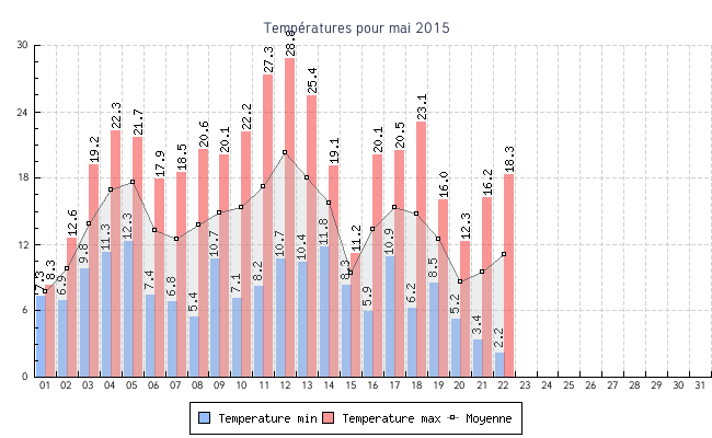 | 22 | 2.2 °C | 18.3 °C | 11.1 °C | 3.9 km/h (40.2 km/h) | NNE |