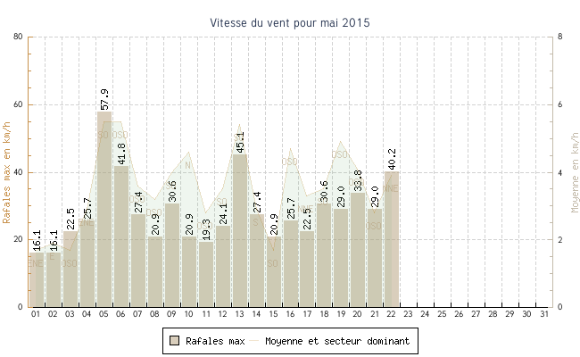 | min | max | moy | Vitesse (rafales) | Secteur | ||